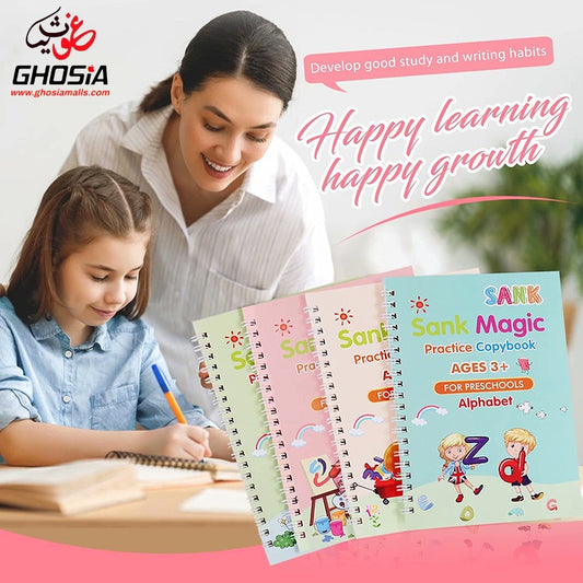 4 in 1 Magic Practice Copybook for Kids – 4 Reusable Writing Practice Book with Magical Pen